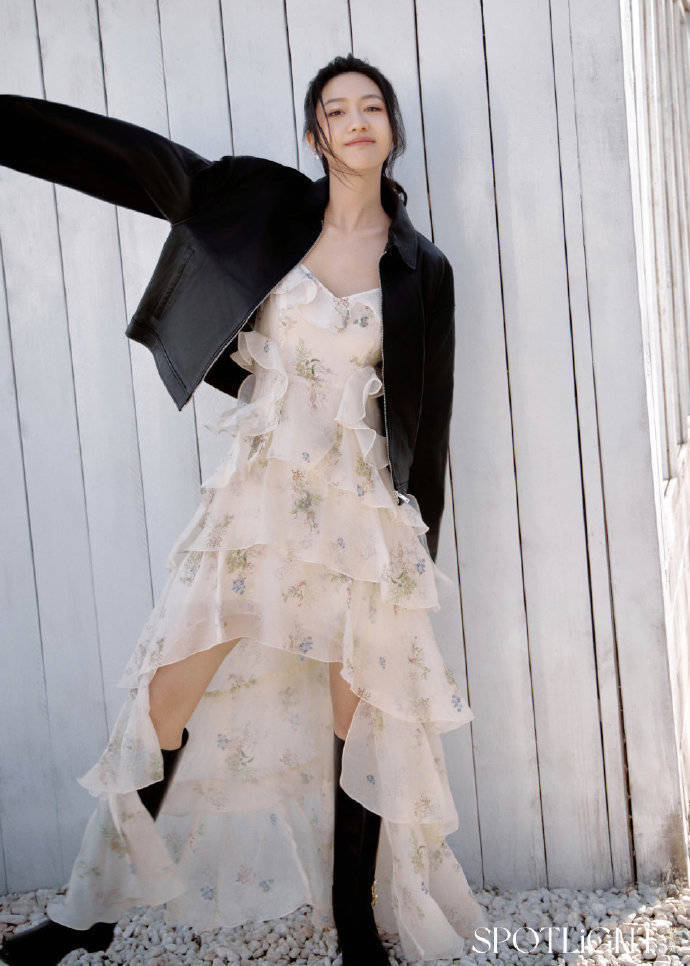 仔细看这套造型真的细节满满!拼色皮夹克来自maison kitsuné 2025春夏系列,拉链设计和金属扣点缀完全就是赛车手标配,内搭简单的白色T恤反而更凸显夹克的复古质感。最绝的是那个高马尾,梳得根根分明还特意留出几缕碎发,既利落又不会显得太刻意,配上她轮廓分明的侧脸线条,难怪网友都说“这是从漫画里走出来的机车少女吧”!而且这次写真里她还尝试了不同以往的冷调妆容,哑光唇釉+大地色眼影,把酷飒感直接拉满。其实向涵之这两年的风格变化还挺让人惊喜的。从之前金鸡奖的温柔长裙,到现在又A又飒的赛车风,她总能精准踩中时尚脉搏。有摄影师分析说,她的五官本身就带着点清冷感,高马尾和皮夹克这种“硬气”单品反而能中和柔美,形成独特的反差魅力。不过最圈粉的还是她拍照时的状态——不是硬凹造型,而是那种“老娘就是最酷”的松弛感,比如微微仰头的角度、随意插兜的姿势,都透着年轻人特有的自在。